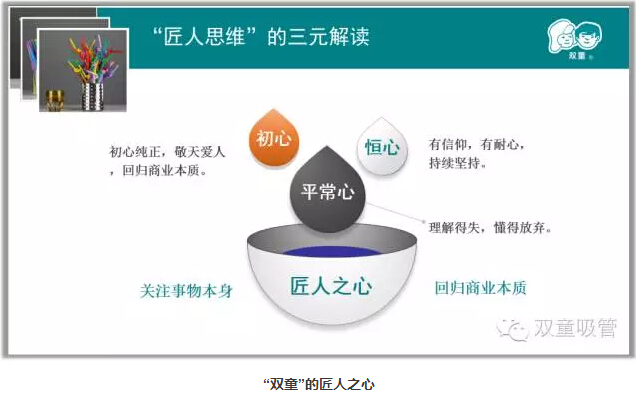 其實真正把自己的產(chǎn)品做好了,企業(yè)在一定時候擴大規(guī)模才是自然而至的,因此不要一畏地想著大,適當做減法,寧可盈利不作大,不可做大不盈利!“雙童”的發(fā)展始終伴隨著不斷的放棄,在自己的領域里細分細分再細分,把一根吸管做到極致!