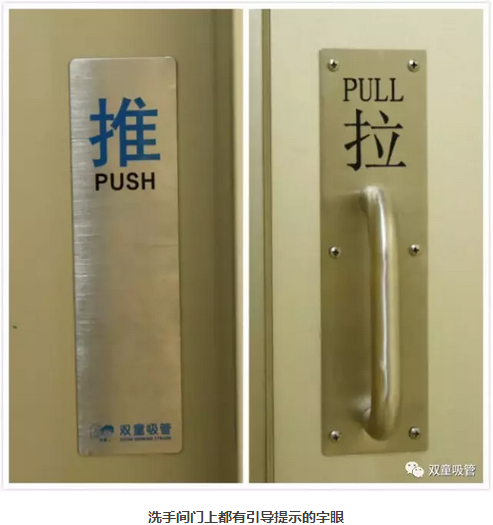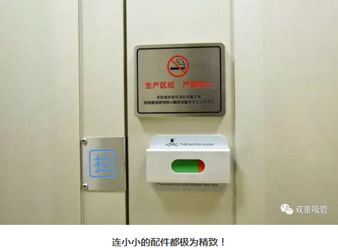 除此之外,衛(wèi)生間內(nèi)還有許多提示引導(dǎo)的標(biāo)示牌,每個配件都極為精致!每扇門上都會有“生產(chǎn)區(qū)域,嚴(yán)禁吸煙”的標(biāo)識,每個蹲位后面都有“便后請沖水、素養(yǎng)高低往往體現(xiàn)在關(guān)上門自己獨(dú)處之時”的溫馨提示,引導(dǎo)員工提升素質(zhì)。偷偷爆個料,所有標(biāo)識牌都是由當(dāng)家人樓總自己設(shè)計的呢!