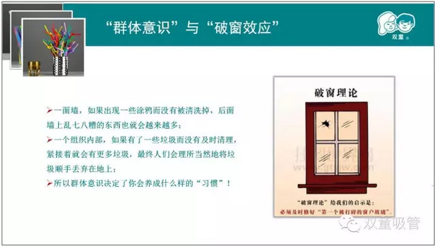 當(dāng)家人樓總常說廁所應(yīng)該是一個企業(yè)最干凈的地方,連廁所都打掃不干凈的企業(yè),怎么可能生產(chǎn)出讓人放心的產(chǎn)品!環(huán)境會潛移默化地影響員工的素養(yǎng),環(huán)境不好則會產(chǎn)生破窗效應(yīng)。一個組織內(nèi)部,如果有了一些垃圾沒有及時清理,就會有更多的垃圾。個體習(xí)慣依附于“群體意識”,“群體意識”決定了你會養(yǎng)成什么樣的習(xí)慣,員工的習(xí)慣影響著員工會做出怎樣的產(chǎn)品,因此優(yōu)質(zhì)硬件是精細(xì)化管理的前提,同時意識引導(dǎo)也至關(guān)重要!