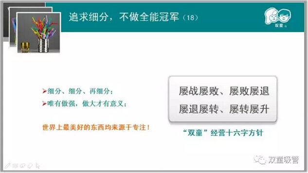 其實真正把自己的產(chǎn)品做好了,企業(yè)在一定時候擴大規(guī)模才是自然而至!“雙童”的發(fā)展始終伴隨著不斷地放棄,在自己的領(lǐng)域里細(xì)分細(xì)分再細(xì)分,把一根吸管做到極致!在利他的基礎(chǔ)上不斷堅持,懂得放棄,關(guān)注事物本身,回歸商業(yè)本質(zhì)!
