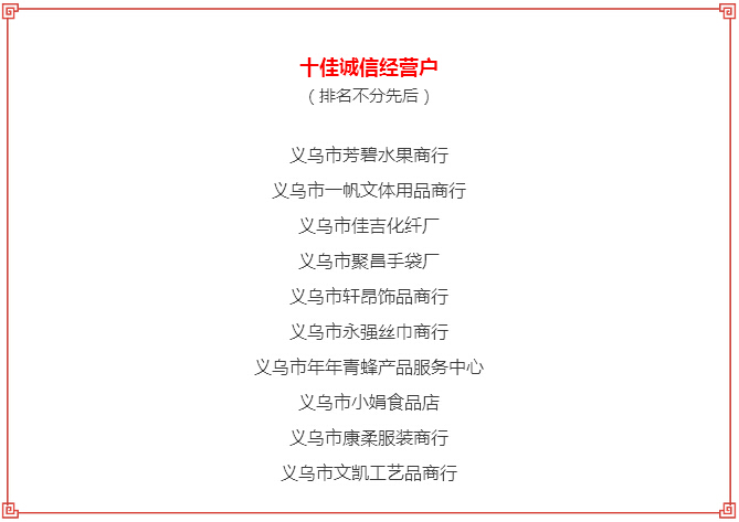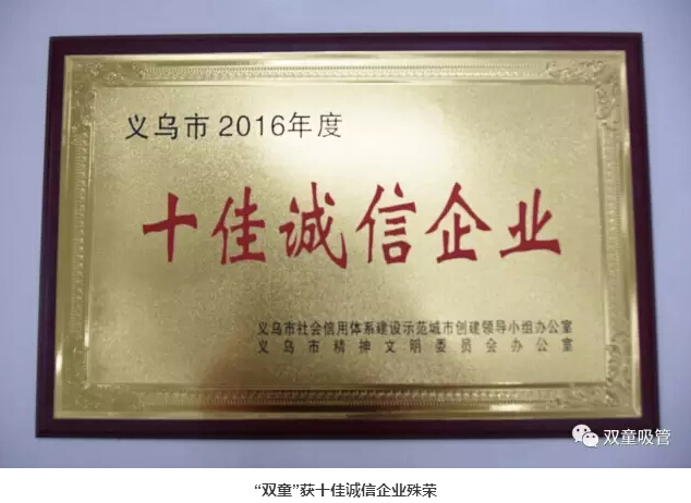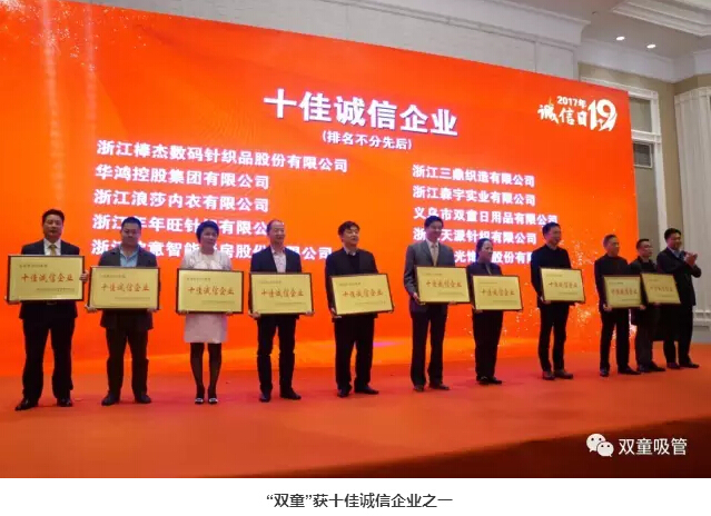 1月9日上午,義烏市2017年“誠信日”暨“義烏中國小商品城”品牌授權(quán)儀式在幸福湖隆重舉行!為褒揚(yáng)守信主體、營造誠信氛圍,當(dāng)天還舉行了首屆守信“紅名單”發(fā)布儀式,為“十佳誠信企業(yè)”、“十佳誠信外商”、“十佳誠信電商”和“十佳誠信經(jīng)營戶”授牌。“雙童”也名列其中,成為“十佳誠信企業(yè)”之一!
