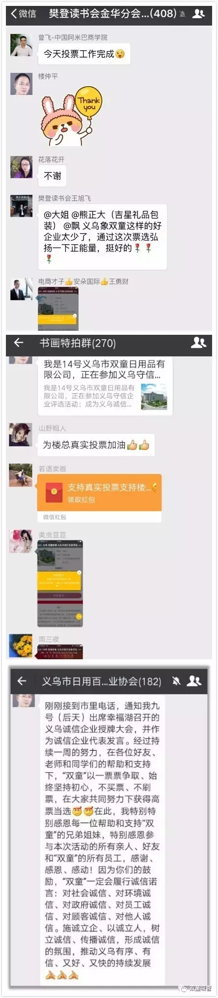 很多好友都積極幫“雙童”投票,吸管妞在此特別感恩每一位支持“雙童”的兄弟姐妹,感恩參與此次活動的所有好友、粉絲和“雙童”的所有員工們!在此特別感謝樊登讀書會和書畫特拍群的好友們,每天都堅持為“雙童”投票,除此之外,還引導(dǎo)自己朋友圈的好友們?yōu)?/span>“雙童”投票,感謝大家支持!