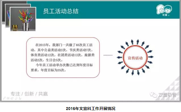 過(guò)去一年,“雙童”微信和微博堅(jiān)持每個(gè)工作日更新原創(chuàng),并開(kāi)展了40次員工活動(dòng),22次宣傳欄等工作!2017年,除了做好原有工作之外,我們將結(jié)合公司第三個(gè)五年發(fā)展規(guī)劃,深入基層,影響員工的思維意識(shí),持續(xù)品質(zhì)提升!
