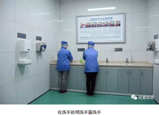 4、整理完衣物后,來到洗手消毒間,進(jìn)行洗手、烘干、消毒。