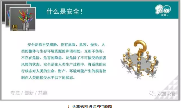 說(shuō)完了企業(yè)文化,安全工作也是必不可少!廠長(zhǎng)通過(guò)員工的安全生產(chǎn)職責(zé)、生活安全注意事項(xiàng)、消防安全等方面詳細(xì)地講解了安全知識(shí)的重要性,并通過(guò)一些令人警醒的案例提醒員工們工作生活中一定要注意安全。