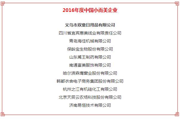 2月26日下午,當家人樓總和二當家李總受邀前往《中外管理》雜志社與泰山管理學院聯(lián)合舉辦的2016年度中國小而美企業(yè)頒獎盛典。此次評選有全國各地56家隱形冠軍企業(yè)的參選申請,經(jīng)過專家評審委員會的評選,共有11家企業(yè)脫穎而出,榮獲“2016年度中國小而美企業(yè)”,“雙童”也名列其中!