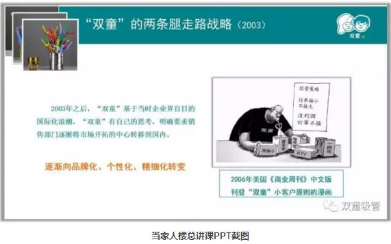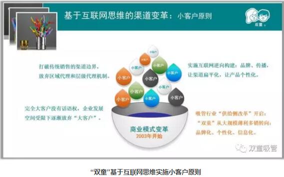 “雙童”是一家互聯(lián)網創(chuàng)新企業(yè),也是中國第一批使用互聯(lián)網尋找商機,聯(lián)絡客戶的企業(yè)!2003年,“雙童”基于互聯(lián)網思維實施了小客戶原則,逐漸放棄“大客戶”,打破傳統(tǒng)銷售的渠道邊界,實施互聯(lián)網逆向構建:品牌、傳播,讓渠道扁平化,產品個性化!