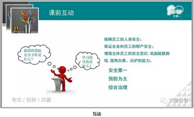 學(xué)習(xí)會一開場,李講師就拋出了互動問題,消防安全方針是什么?“安全第一 、預(yù)防為主、綜合治理”,童鞋們異口同聲的回答了這個問題,看來我們平時的安全教育工作還是很見效的!