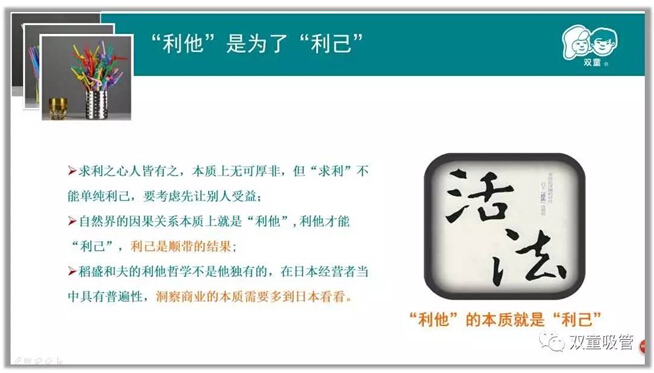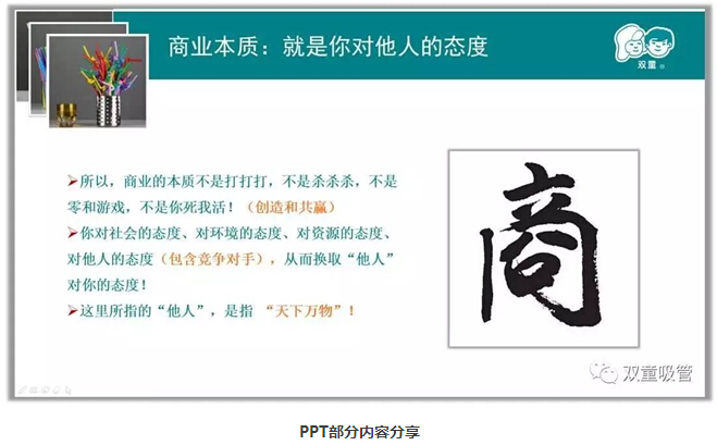 商業(yè)本質(zhì)上就是你對(duì)他人的態(tài)度,所以,商業(yè)的本質(zhì)不是打打打,不是殺殺殺,不是零和游戲,不是你死我活!“雙童”的節(jié)能降耗措施、零排放、無污染,對(duì)員工的態(tài)度本質(zhì)上就是我們對(duì)他人的態(tài)度,所以“利他”其實(shí)是利于天下萬物,商業(yè)是創(chuàng)造與共贏,你對(duì)社會(huì)的態(tài)度、對(duì)環(huán)境的態(tài)度、對(duì)資源的態(tài)度、對(duì)他人的態(tài)度(包含競(jìng)爭(zhēng)對(duì)手),從而換取“他人”對(duì)你的態(tài)度,這也是利他的背后一定是利已的商業(yè)本質(zhì)!