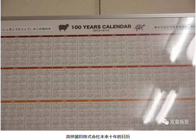 吸管妞最后還要和大家分享一個(gè)讓我們游學(xué)團(tuán)深受震撼的細(xì)節(jié)。在會(huì)議室的墻上,細(xì)心的“雙童”游學(xué)團(tuán)發(fā)現(xiàn)了一個(gè)有趣的細(xì)節(jié):墻上竟然貼著從2015年到2114年的日歷。為什么要掛一個(gè)100年的日歷在墻上呢?高橋先生笑著回答:“我們認(rèn)為人的生命短暫無(wú)常,在這100年里你無(wú)法知道自己將會(huì)在哪一天離開(kāi)世界,所以每一天都需要好好珍惜,全力以赴地工作和生活,為社會(huì)帶來(lái)美好和價(jià)值!”這么棒的回答,引發(fā)了“雙童”游學(xué)團(tuán)的自發(fā)掌聲!
