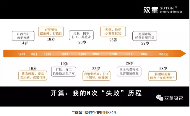 下面吸管妞就和大家來分享樓仲平在兩次課程當中的精彩分享吧!首先,“雙童”樓仲平分享了自己的創(chuàng)業(yè)經(jīng)歷,14歲跟隨父親去江西“雞毛換糖”,在“雞毛換糖”的過程當中勇于創(chuàng)新,持續(xù)折騰。期間做了二十多個行當,經(jīng)過多次失敗后于1994年創(chuàng)辦雙童吸管。