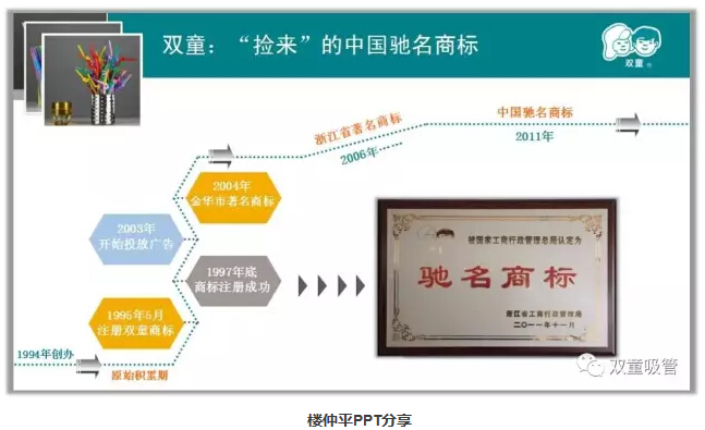 原來,“雙童”品牌的核心——一男一女的商標圖案在最初時,幾乎全國的吸管廠都在用,產(chǎn)品、包裝、規(guī)格都一樣,只是廠家信息不同。這個現(xiàn)象讓樓仲平很好奇,他就拿著這個圖案找義烏工商局咨詢,義烏工商局的科長直截了當?shù)母嬖V他,這一定是已經(jīng)注冊過的商標了!但是樓仲平并不死心,花了三百塊錢查詢費要求科長在電腦上查一下,經(jīng)過查證之后發(fā)現(xiàn)這個商標還真沒有人注冊,陳科長通知樓仲平:“你要注冊的話帶齊相關證件,自己過來注冊”。最后,樓仲平搶占了先機,用了2000元把這個圖案注冊為商標,在和妻子商議之后,確定了“雙童”作為商標的名字,兩個兒童一男一女,比較容易記憶。就是這樣,“撿來”了“雙童”的商標,也邁出了企業(yè)的品牌建設和發(fā)展最為關鍵的一步!