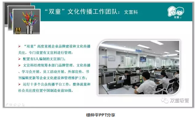 第四階段:文化自傳播階段。傳統(tǒng)意義上,“品牌推廣”是各路媒體的事。但現(xiàn)在這個時代背景下,自媒體已經(jīng)成為品牌的傳播主流,企業(yè)需要自己講好自己的“故事”。“雙童”高度重視企業(yè)的自媒體傳播,專門設置有5人編制的文宣部門,負責運營微博、微信、官方網(wǎng)站等十幾個自媒體應用平臺,整體流量和社會關注度位置中國制造業(yè)前50強!