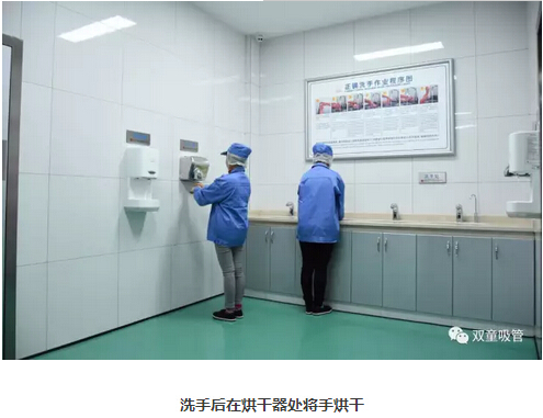 4、整理完衣物后,來到洗手消毒間,進(jìn)行洗手、烘干、消毒。