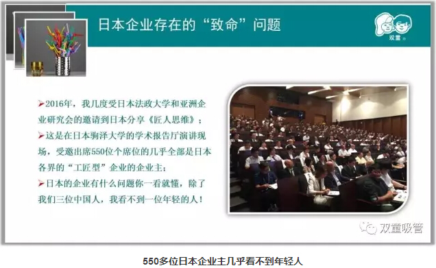 “工匠精神”其實(shí)是一把雙刃劍,樓仲平通過(guò)日本企業(yè)的案例闡述了這一觀點(diǎn):“去年開始,我?guī)锥仁苋毡痉ㄕ髮W(xué)和亞洲企業(yè)研究會(huì)的邀請(qǐng)到日本分享《匠人思維》,在分享過(guò)程中,我發(fā)現(xiàn)一個(gè)很明顯的問(wèn)題,基本上來(lái)聽課學(xué)習(xí)的幾乎是60歲以上的日本企業(yè)主,幾乎看不見年輕人。究其原因,是由于極致的工匠精神讓日本的年輕人不愿意接班。同時(shí),隨著日本企業(yè)主平均年齡越來(lái)越大,普遍缺乏時(shí)代變革下的創(chuàng)新思維,導(dǎo)致日本大量工匠企業(yè)被時(shí)代拋棄。所以,我們要慎防成也工匠精神,敗也工匠精神!”