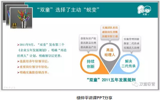 通過(guò)樓仲平個(gè)人的迭代,也促進(jìn)了“雙童”團(tuán)隊(duì)的蛻變,推動(dòng)團(tuán)隊(duì)向年輕化、知識(shí)化和信息化轉(zhuǎn)變。2011年9月,“雙童”發(fā)布了第二個(gè)《企業(yè)五年發(fā)展規(guī)劃》,明確“再造經(jīng)理人”計(jì)劃,明確領(lǐng)導(dǎo)層更替:選拔培養(yǎng)年輕領(lǐng)導(dǎo)層、重要崗位領(lǐng)導(dǎo)年輕化、明確實(shí)施股份制改革,慢慢解決管理層老化問(wèn)題!重組后的“雙童”團(tuán)隊(duì)平均年齡不到三十歲,大部分核心團(tuán)隊(duì)的工齡在十年以上,學(xué)歷、知識(shí)層次和忠誠(chéng)度大幅提高!