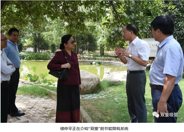 “雙童”樓仲平首先帶領部長先生一行參觀了“雙童”的廢水收集處理循環(huán)回用系統(tǒng)。他介紹道:“別看這只是一口普通的景觀湖,其實它分為上下兩層,上層是一米多深的景觀養(yǎng)魚湖,下層是四米五深的中水儲存池,專門用于儲存廢水呢!我們廠區(qū)內(nèi)所有員工產(chǎn)生的生活廢水都會被過濾后匯集到儲存池,用于綠化噴淋、洗車清潔、馬桶沖水等,不花費企業(yè)一分錢!”