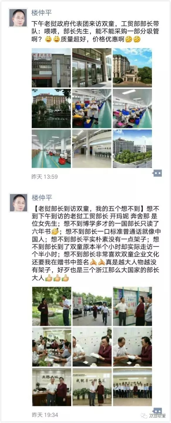 不知不覺,部長一行在“雙童”原本半個小時的走訪實際卻走訪了一個多小時。走訪期間,開瑪妮·奔舍那部長也不斷重復著“我真是太喜歡‘雙童’了”,并連續(xù)6次與樓總合影!臨走前,部長先生也加了樓仲平的微信,并歡迎“雙童”去老撾?yún)⒂^考察,看看是否有機會在老撾投資。部長先生說道:“因為我真的太喜歡‘雙童’了!”