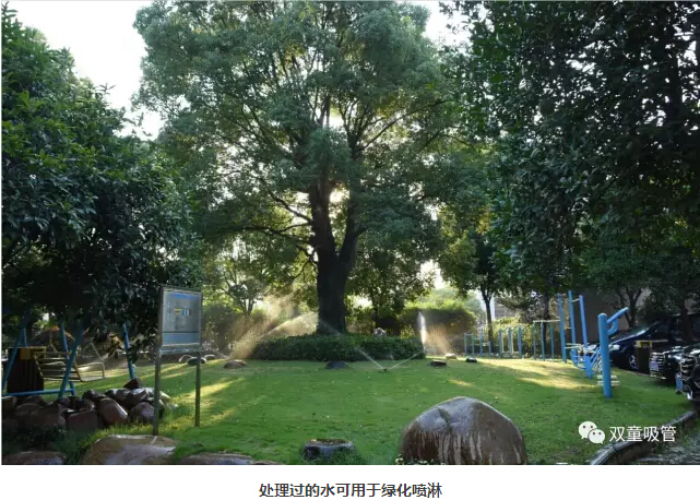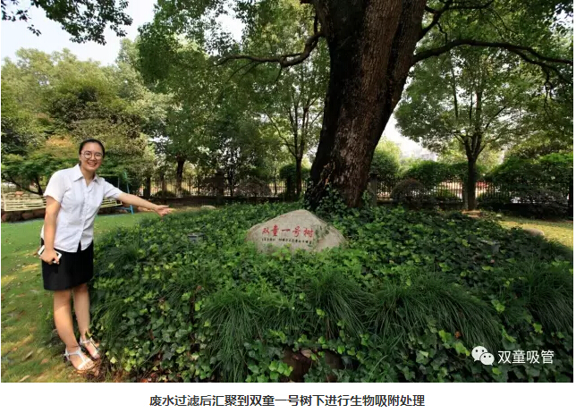 所謂“廢水收集處理循環(huán)回用系統(tǒng)”,其實(shí)就是將員工的生活廢水過濾后匯聚到“ 雙童一號樹”下進(jìn)行生物吸附處理,再流入中水儲存池,并為廠區(qū)所有衛(wèi)生間的馬桶沖水、綠化噴淋和道路清洗、車輛清洗所用,使公司的員工生活用水量節(jié)省了65%,每年為公司節(jié)省水費(fèi)支出40多萬元!