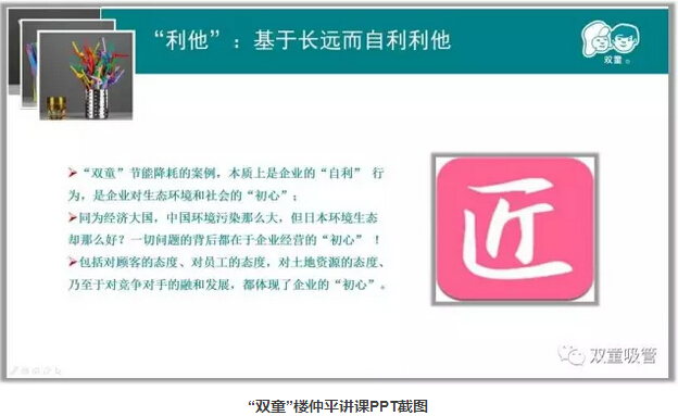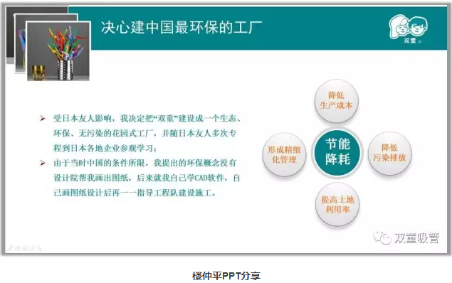 2002年開始,樓仲平隨日本友人桑原道昭先生參觀日本企業(yè),受日本“利他經(jīng)營(yíng)”文化影響,立志要將“雙童”建設(shè)為一個(gè)生態(tài)、環(huán)保、無污染、無排放的花園式工廠。于是,樓仲平克服重重困難親自設(shè)計(jì)并建立了雨水收集系統(tǒng)、廢水處理、設(shè)備余熱水循環(huán)利用等節(jié)能降耗設(shè)施。