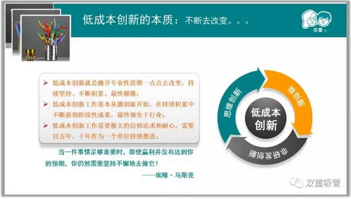 樓仲平首先簡(jiǎn)要介紹了“雙童”的大致情況,也談到自己對(duì)低成本創(chuàng)新的認(rèn)識(shí)和理解。通過“雙童”低成本創(chuàng)新的案例,樓仲平介紹了“雙童”通過“思維創(chuàng)新”、“內(nèi)部協(xié)作創(chuàng)新”以及“專業(yè)團(tuán)隊(duì)創(chuàng)新”這三個(gè)階段展開的低成本創(chuàng)新工作采用的方法及得到的實(shí)際效果,說明了企業(yè)的低成本創(chuàng)新方式也可以取得卓越的成效!樓仲平干貨十足的分享獲得了在場(chǎng)企業(yè)管理者們的一致掌聲!