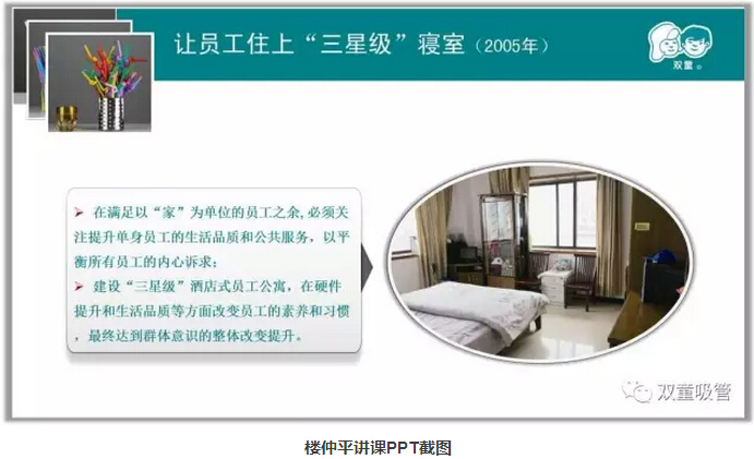 其實(shí),“雙童”樓仲平由于早年坎坷辛苦的創(chuàng)業(yè)經(jīng)歷,一直對(duì)農(nóng)民工感同身受,十分注重員工的吃住問(wèn)題。早在2012年,樓仲平就發(fā)布了一條關(guān)于員工住宿的微博,引起了極大的關(guān)注。微博上寫(xiě)道:自己住洋房別墅,卻讓員工住的像牛棚狗窩,你怎么能留得住員工?員工是企業(yè)的基礎(chǔ),對(duì)員工更好、企業(yè)反而會(huì)獲得更多!