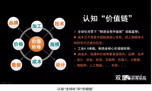 在全球化的背景下,成本不再是制造業(yè)的核心優(yōu)勢(shì)。企業(yè)必須面對(duì)時(shí)代的不斷變化,產(chǎn)業(yè)發(fā)展“棲”水草而居,中國(guó)制造商業(yè)競(jìng)爭(zhēng)“價(jià)值鏈”轉(zhuǎn)移逐漸從“規(guī)模型”向“價(jià)值型”轉(zhuǎn)變。企業(yè)經(jīng)營(yíng)“核心價(jià)值鏈”轉(zhuǎn)移,由成本、價(jià)格、設(shè)備、產(chǎn)品等要素逐漸轉(zhuǎn)向品牌、渠道、標(biāo)準(zhǔn)、研發(fā)、數(shù)據(jù)、互聯(lián)網(wǎng)…… 傳統(tǒng)業(yè)主杯具時(shí)代已經(jīng)來臨:經(jīng)驗(yàn)逐漸成為毒藥!