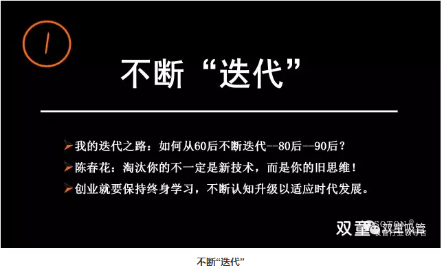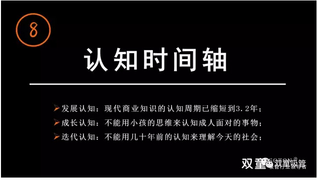 現(xiàn)代商業(yè)知識(shí)的認(rèn)知周期已縮短到3.2年,我們不能用小孩的思維來認(rèn)知成人面對(duì)的事物,更不能用幾十年前的認(rèn)知來理解今天的社會(huì)。每個(gè)人的成長(zhǎng)伴隨著不斷的否定,在認(rèn)知、糾錯(cuò)、不斷改變下實(shí)現(xiàn)自我成長(zhǎng)。“創(chuàng)業(yè)者”最應(yīng)該有“時(shí)間軸”的概念,需要擁有自我蛻變的能力,否則你就很難成長(zhǎng)!
