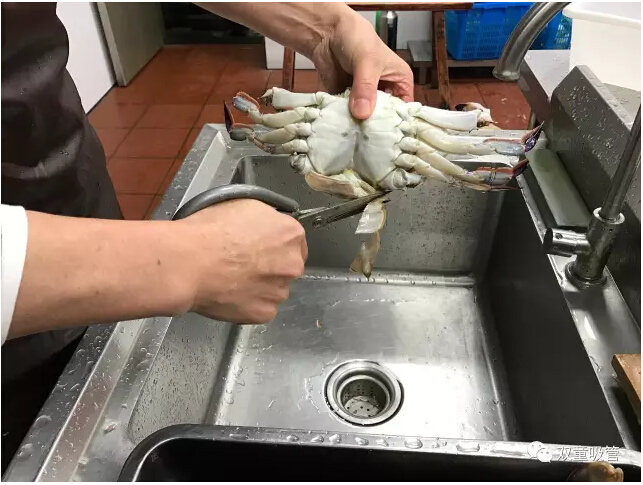 10、將螃蟹嘴部的砂囊取出來,一定要找到取出,否則燒出的豆腐蟹會有砂子。