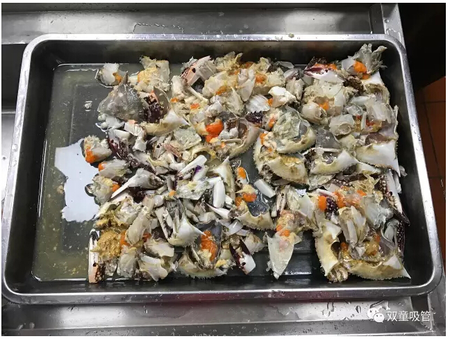 17、螃蟹清洗宰殺完畢準備烹煮,宰殺后的螃蟹千萬千萬不能清洗了,連同黑乎乎湯汁(膏體)一并燒進去。
