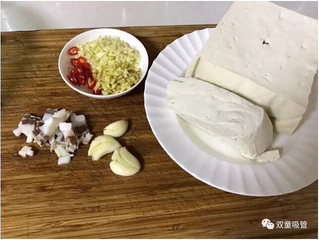19、準備適量火腿,準備新鮮的鹽鹵嫩豆腐,一般一斤螃蟹配3斤左右豆腐,豆腐一定要新鮮水嫩。