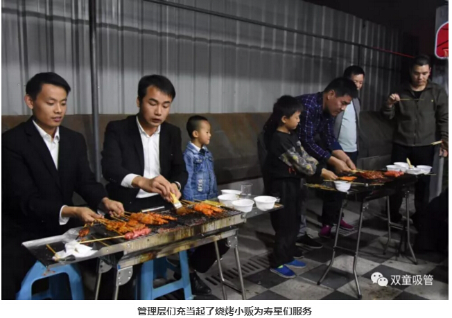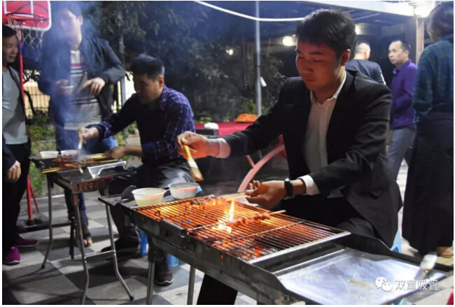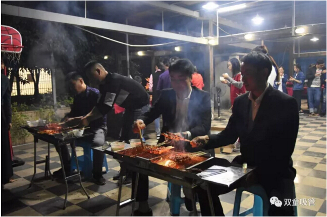 咦?車間管理們也爭當(dāng)起了“燒烤小販”,為壽星們進行服務(wù)。員工們喝著美酒吃著主管們烤的肉串,別提多開心啦!往往員工手上的還沒吃完,這邊領(lǐng)導(dǎo)們就已經(jīng)笑瞇瞇地把新烤好的肉串奉上了,吃都來不及,這是什么節(jié)奏?