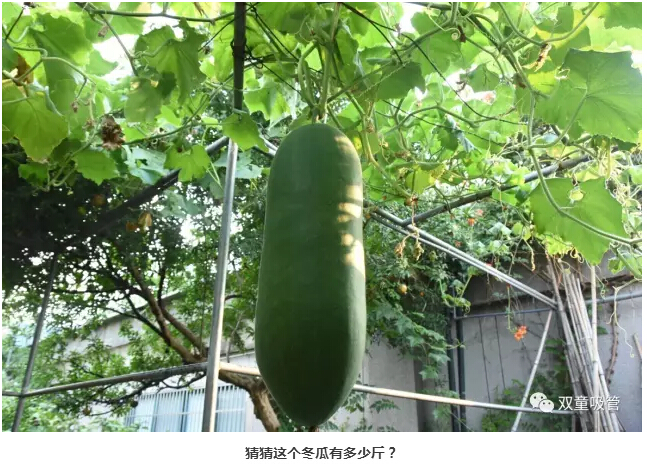 再來看看這一個(gè),長得“五大三粗”都快壓彎了枝架,這么大的冬瓜大家都爭著和它合影呢!猜猜有多重呀?