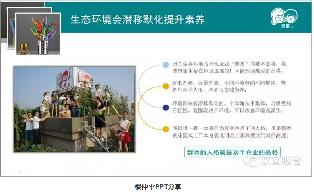 除此之外,屋頂菜園、廠區(qū)的綠化、甚至是隨處可見的鏡框標(biāo)語都在潛移默化地影響著員工,瓜果飄香的花園式工廠本身就說明員工素養(yǎng)要達(dá)到新的高度。通過這樣的方式,員工長時(shí)間自律提升后就形成了自身的行為習(xí)慣,在改善工作生活的同時(shí)形成精細(xì)化管理氛圍。所以,即使沒有明令禁止,“雙童”人也非常自覺不會去采摘柚子,更不會破壞廠區(qū)里的一草一木!