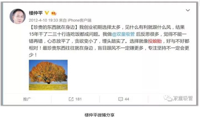 樓仲平回憶自己曾在2012年發(fā)布的微博中表明:“我在創(chuàng)業(yè)初期選擇太多,見什么有利就跟什么風(fēng),結(jié)果15年干了二三十行,一事無成。做雙童吸管后常反思,心態(tài)放平了,貪欲變小了,埋頭踏實了。”