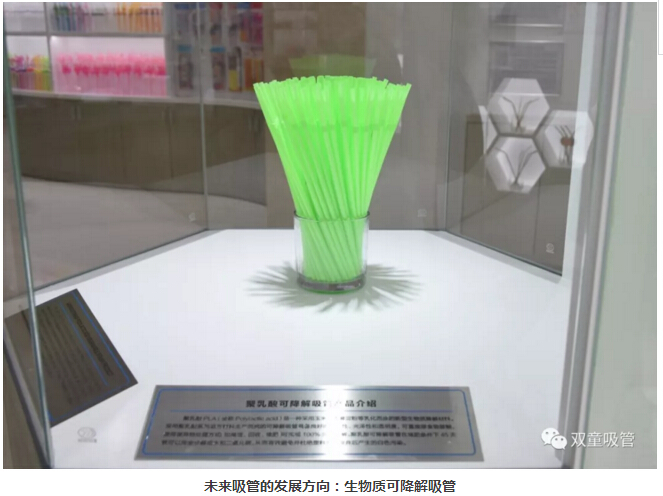 值得關(guān)注的是,博物館中還陳列著“雙童”研發(fā)的聚乳酸可降解吸管。這種吸管由玉米或淀粉乳化而成,在堆肥條件下45天就可以分解為水和二氧化碳,有效地避免了塑料制品所造成的白色污染問題。但由于聚乳酸等可降解材料的原料價格過于昂貴,客觀上會受成本過高的限制,過高的產(chǎn)品售價暫時還難以被市場和消費(fèi)者大范圍接受。但是,我們堅信,這一定是吸管行業(yè)未來發(fā)展和研究的主要方向!