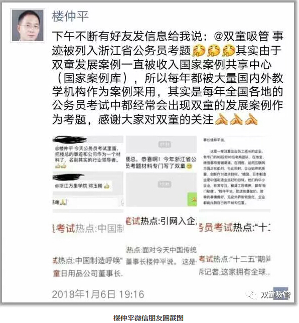 近日,2018年浙江公務(wù)員考試已順利落下帷幕!不少粉絲也紛紛給“雙童”樓仲平“道喜”:樓總,你們“雙童吸管”的事跡又一次被列入浙江省公務(wù)員考題啦! 對此,“雙童”樓仲平也專門發(fā)布了朋友圈向大家說明了其中緣由。