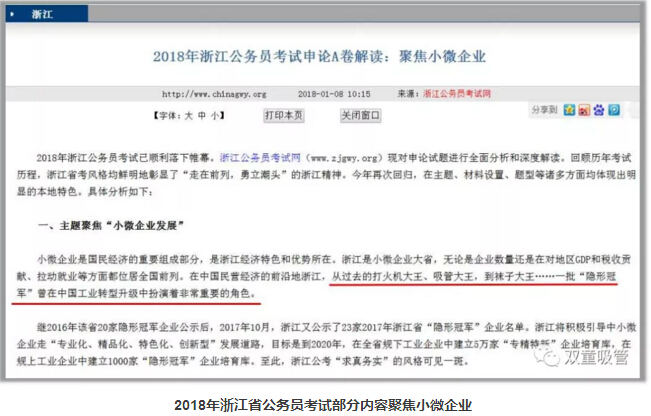 小微企業(yè)是浙江經(jīng)濟(jì)特色和優(yōu)勢所在,所以在2018年浙江省公務(wù)員考試的申論材料中,特地提到了義烏S公司堅(jiān)守吸管實(shí)業(yè),推動(dòng)了中國工業(yè)的轉(zhuǎn)型升級(jí),成為了浙江企業(yè)的標(biāo)桿!“雙童”也再次被列入公務(wù)員考題。