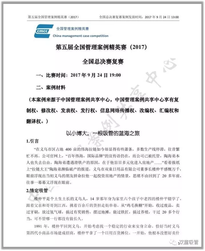 在2017年全國管理案例精英賽中,《以小博大,一根吸管的藍(lán)海之旅》案例還成為了精英賽總決賽的案例!原來,組委會(huì)在挑選總決賽案例素材時(shí),更傾向于挑選具有時(shí)代背景、可評價(jià)性和標(biāo)桿性的案例,他們希望通過對該案例的分析,引導(dǎo)大學(xué)生對企業(yè)商業(yè)模式和核心競爭力的認(rèn)知,加深在時(shí)代背景下對制造業(yè)的認(rèn)知。在挑選過程中,他們一致認(rèn)為“雙童吸管”案例最符合他們的期望!