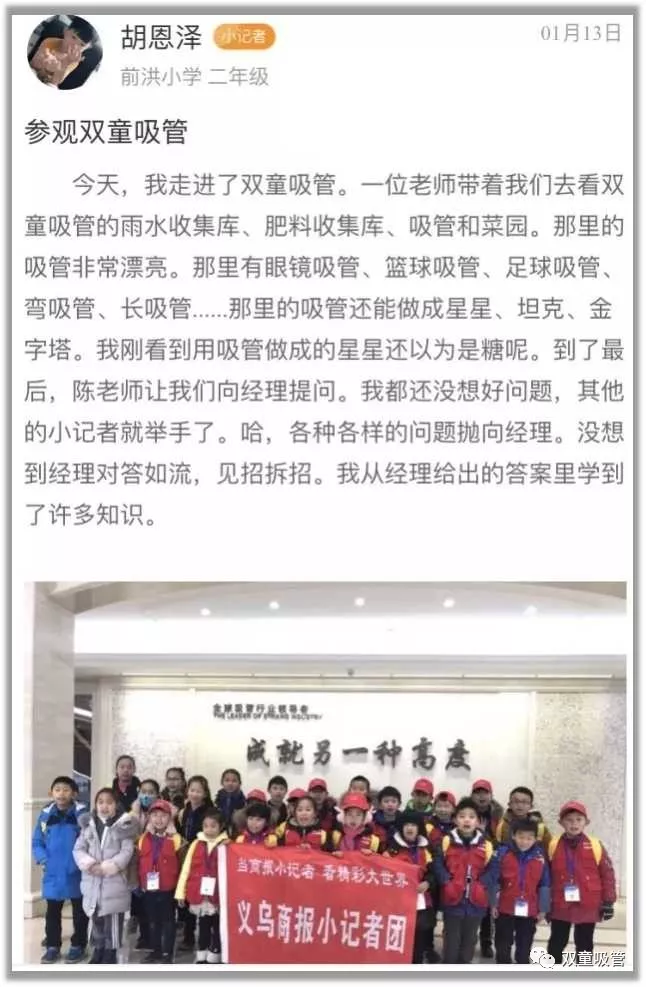 上周末,吸管妞接待了兩批特殊的客人,他們是來自義烏商報的小記者團(tuán),以及新華小記者們,而他們此行最主要的目的就是參觀中國吸管博物館,采訪以樓仲平為主的“雙童”管理團(tuán)隊們,探索小吸管的大世界!