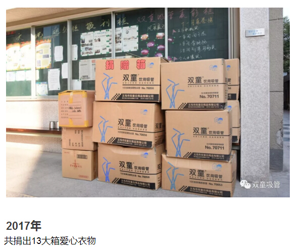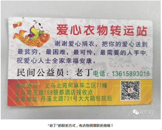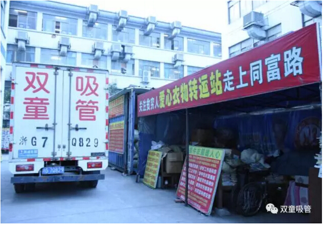 前幾天,吸管妞也將收拾好的衣物送至“義烏十大好人”老丁的衣物捐贈處。由于衣物太多,我們用了“雙童”的廠車運輸,順便也給我們自己做了宣傳,哈哈?。±隙”硎荆菏指兄x“雙童”多年來堅持舉辦暖冬活動,也希望有更多的人能夠參與到此項活動中來!